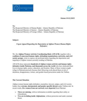 گروهی از فعالان حقوق بشر و سازمانهای مدافع حقوق زنان در یک نامهٔ سرگشاده و فوقالعاده عاجل به دولت پاکستان خواستار توقف فوری اخراج زنان افغانستان به افغانستان تحت حاکمیت طالبان شدند. این زنان به دلیل فعالیتهای مدنی، حقوق بشری و دفاع از حقوق زنان تحت تهدید شکنجه و تعقیب طالبان قرار داشتند و به پاکستان پناه آورده بودند. مقامات این کشور اکنون تصمیم به بازگشت این زنان به افغانستان گرفتهاند که به گفته فعالان میتواند خطرات جانی جدی برای آنان به دنبال داشته باشد.